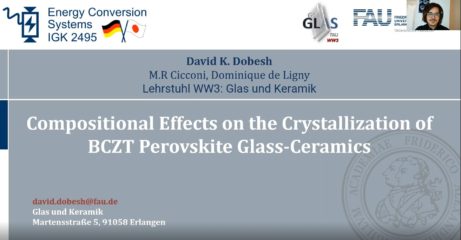 Contributions to the international conference were accomplished by David Kotaro Dobesh with the oral presentation of „Compositional Effects on the Crystallization of BCZT Perovskite Glass-Ceramics“. The contribution was presented in the GOMD S1 session: Glass Crystallization and Glass-Ceramics led by industry and scientific leaders. The session included advances in the fundamental understanding of crystallization in glasses, novel processing techniques for glass-ceramics, amorphous phase separation and the role in crystallization, and modeling aspects of nucleation and growth in glass-forming materials.