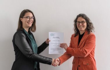 Marina, doctoral candidate in Project E, gave her talk ” ML prediction of photoluminescence from high-throughput density functional theory ground state properties on the example of Cs2AgxNa1−xBiyIn1−yCl6” at the Molecular Modelling Workshop in Erlangen. Lead-free halide double perovskites have been an emerging material class for various applications in the field of optoelectronics over the last couple of years due to their environmental friendliness and exceptional stability. Enlarging the material class even further by introducing interchangeable ion ratios leads to a demand for high-throughput screening. High-throughput screening can be done experimentally using robotic synthesis and computationally by the automation of density functional theory calculations. For a deeper understanding these approaches are combined in a machine learning approach. For her talk, Marina was honoured with the Lecture Award handed out by Prof. Petra Imhof from CCC Erlangen. Congratulations!
