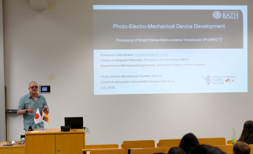 The final day began with a lecture by Dr. Manuel Hinterstein (Fraunhofer IWM) on advanced diffraction techniques for coupled materials, including synchrotron and nuclear diffraction. His presentation highlighted the capabilities of these methods in resolving structural changes under multiple external stimuli, providing valuable insights into the complex interactions within PEM systems. Prof. Chris Bowen (University of Bath, UK) then discussed the development of photo-electro-mechanical devices, outlining strategies for integrating light, electrical, and mechanical responses into functional prototypes. This was followed by Dr. Joe Briscoe’s (Queen Mary – University of London, UK) exploration of optically controlled domain switching in BaTiO3 thin-films. His work demonstrated sub-500 millisecond switching speeds enabled by reduced strain and photoexcited carriers, supported by density functional theory and molecular dynamics simulations. Dr. Briscoe emphasized the potential of such systems in neuromorphic computing, particularly for low-energy artificial intelligence applications. The final lecture of the summer school was given by IGK 2495 principal investigator Prof. Georg Fischer who presented on multifunctional PEM harvesters. Using examples such as smart shoes and adaptive clothing, he illustrated how light, vibration, and thermal gradients can be synergistically combined to achieve efficient energy generation. His talk addressed both theoretical and practical aspects, including transducer modelling, circuit topologies, and real-world challenges such as actuation and diode losses.