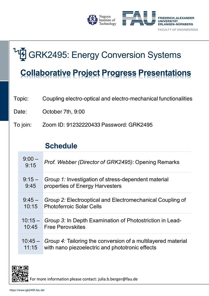 GRK2495 is one of the first international doctoral programs at FAU, which is a joint research and training project together with the Nagoya Institute of Technology, Japan in the area of electro-optical and electro-mechanical materials and devices for multifunctional energy harvesting systems. In order to facilitate and increase cross-disciplinary collaboration, GRK2495 includes an engineering and materials development competition.